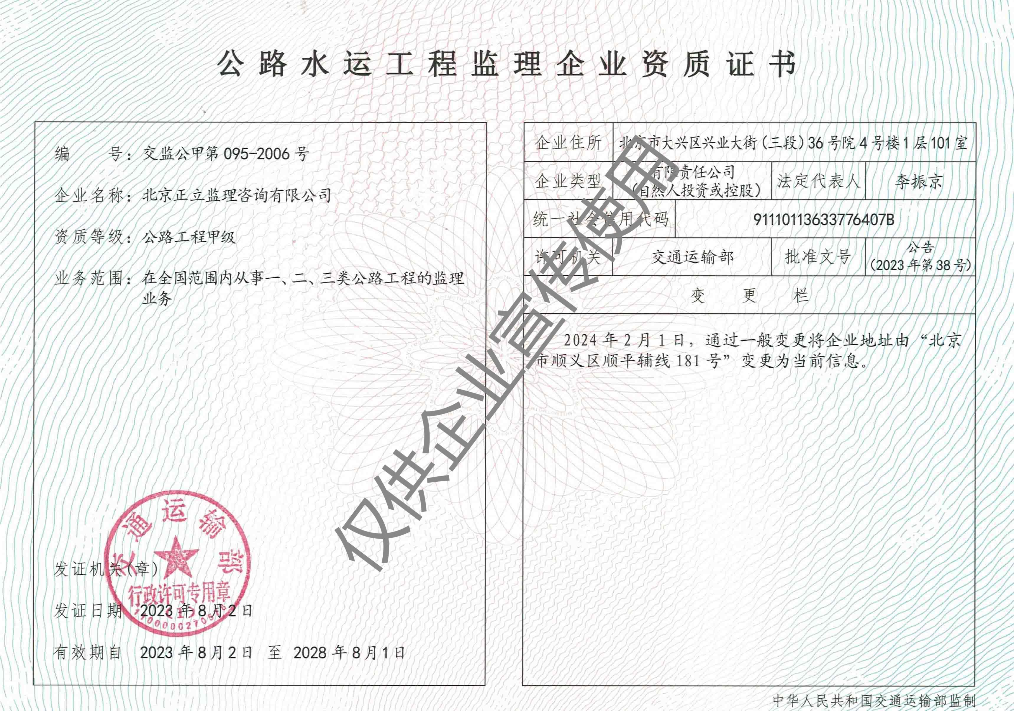 北京正立監(jiān)理咨詢有限公司成立于1998年7月1日,其前身隸屬于北京市公路質(zhì)量監(jiān)理站。具有獨(dú)立法人資格,是獨(dú)立核算、自負(fù)盈虧的經(jīng)濟(jì)實體。企業(yè)經(jīng)營范圍:公路工程監(jiān)理、交通工程監(jiān)理、市政公用工程建設(shè)監(jiān)理、工業(yè)與民用建筑工程監(jiān)理、工程監(jiān)理咨詢、技術(shù)咨詢、技術(shù)培訓(xùn)等。